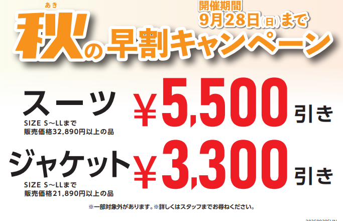 【スーツ・ジャケット】サカゼン秋の早割キャンペーン 【~9月28日まで】